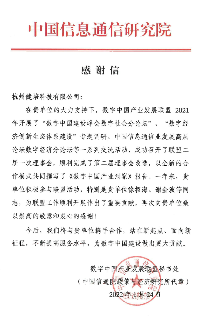年前上班最后一天,一大早就收到了數(shù)字中國產(chǎn)業(yè)發(fā)展聯(lián)盟秘書處發(fā)來的感謝信。這是對(duì)健培科技這一年來積極投入數(shù)字醫(yī)療創(chuàng)新行動(dòng)的肯定,特別是公司副總裁徐招海、總助謝金波等同事,積極參與聯(lián)盟主持的各項(xiàng)工作,結(jié)合公司數(shù)字醫(yī)療行業(yè),為數(shù)字化改革提供健培科技的一份理解與實(shí)踐。