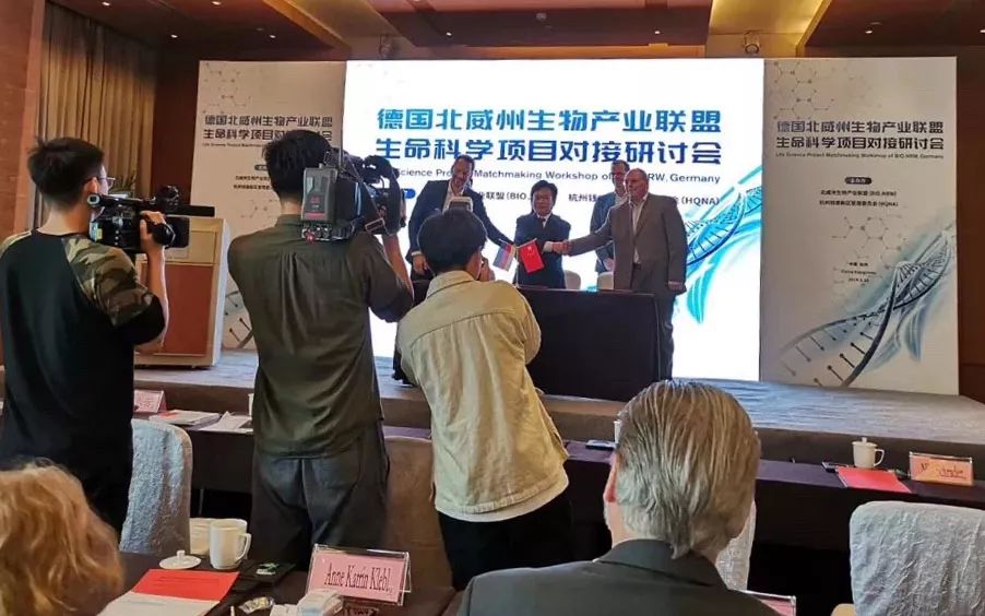 5月10日(周五)上午, 錢塘新區(qū)與德國(guó)北威州生物產(chǎn)業(yè)聯(lián)盟舉辦項(xiàng)目合作對(duì)接會(huì)并簽署合作備忘錄 。北威州生物產(chǎn)聯(lián)盟主席Dr. Nils Schrader致辭并介紹ChInValue計(jì)劃,杭州市投資促進(jìn)局徐文霞副局長(zhǎng)、錢塘新區(qū)管委會(huì)副主任王永芳、于利希研究中心外部資金管理主管Mr.Immo Wetcke共同簽署合作備忘錄。