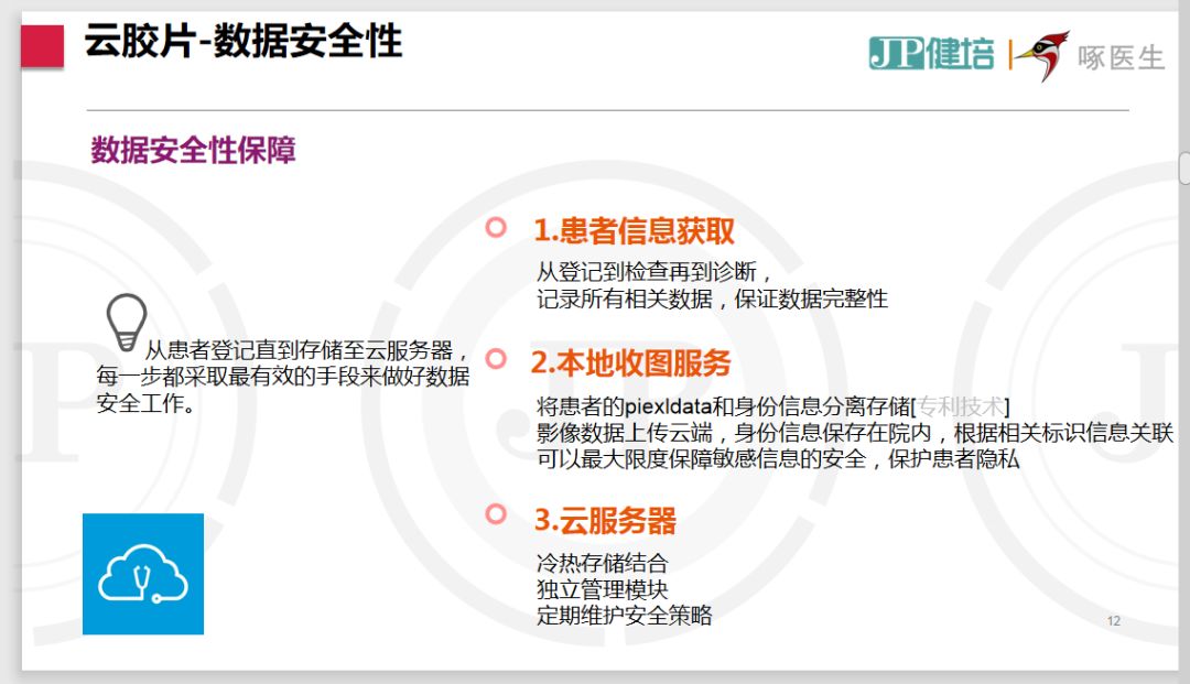 健培科技蘭小金介紹到,健培采用獨有的圖像和信息分離技術(shù)最大限度保障了患者信息的安全。從患者登記直到存儲至云服務(wù)器,每一步都采取最有效的手段來做好數(shù)據(jù)安全工作。健培獨有的piexldata和身份信息分離存儲技術(shù),可以使影像數(shù)據(jù)上傳云端,身份信息保存在院內(nèi),以最大限度保障敏感信息的安全、保護患者隱私。