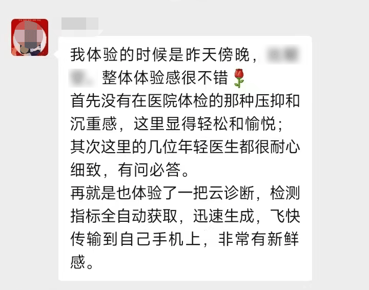 現(xiàn)場氣氛輕松愉快、和諧熱烈,受到了客戶的一致好評。周女士表示:整體體驗感很不錯,首先沒有在醫(yī)院體檢的那種壓抑和沉重感,這里顯得輕松和愉悅,而且第一次體驗了一把人工智能云診斷,檢測指標全自動獲取,迅速生成,飛快傳輸?shù)阶约菏謾C上,非常有新鮮感。