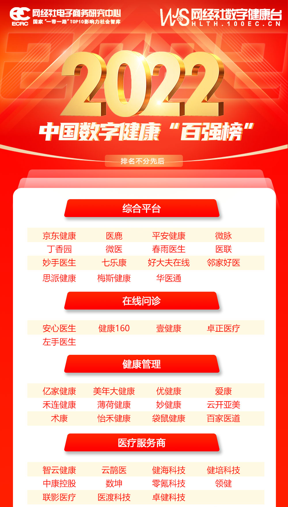 《2022年度中國數(shù)字健康“百強(qiáng)榜”》,旨在反映當(dāng)前國內(nèi)數(shù)字健康企業(yè)發(fā)展總貌。該榜單經(jīng)過網(wǎng)經(jīng)社電子商務(wù)研究中心根據(jù)大數(shù)據(jù)庫“電數(shù)寶”收錄的企業(yè)數(shù)據(jù),包括平臺(tái)規(guī)模、營收、利潤、投融資(估值) 、月活、評(píng)級(jí)等硬性指標(biāo)以及行業(yè)影響力、口碑等軟性指標(biāo)綜合評(píng)估而成。榜單根據(jù)行業(yè)11個(gè)細(xì)分領(lǐng)域構(gòu)成,共100家企業(yè)。健培科技、京東健康、智云健康、微脈等上榜,上榜企業(yè)均為各領(lǐng)域的國內(nèi)領(lǐng)先平臺(tái)。