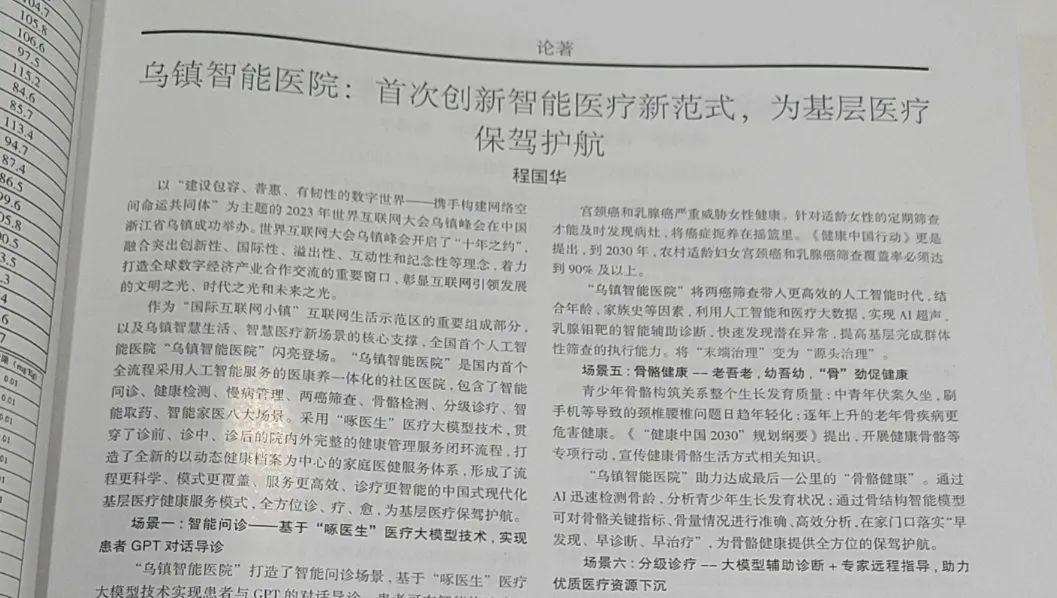 近日,健培科技CEO程國華的署名文章《烏鎮(zhèn)智能醫(yī)院: 智能醫(yī)療新范式,為基層醫(yī)療保駕護航》,在國家級優(yōu)秀醫(yī)學(xué)科技期刊《智慧醫(yī)學(xué)(2023年11月第32期)》發(fā)表。這是近期2023年世界互聯(lián)網(wǎng)大會?烏鎮(zhèn)峰會上,全國首個人工智能醫(yī)院“烏鎮(zhèn)智能醫(yī)院”開業(yè)之后,一次全面的闡述人工智能醫(yī)院的內(nèi)容與功能。作為國內(nèi)首個全流程采用人工智能服務(wù)的醫(yī)康養(yǎng)一體化的社區(qū)醫(yī)院,文章中針對智能問診、健康檢測、慢病管理、兩癌篩查、骨骼檢測、分級診療、智能取藥、智能家醫(yī)主要八大落地場景的應(yīng)用進行了詳細闡述。“烏鎮(zhèn)智能醫(yī)院”采用“啄醫(yī)生”醫(yī)療大模型技術(shù),貫穿了診前、診中、診后的院內(nèi)外完整的健康管理服務(wù)閉環(huán)流程,打造了全新的以動態(tài)健康檔案為中心的家庭醫(yī)健服務(wù)體系,形成了流程更科學(xué)、人群更覆蓋、服務(wù)更高效、診療更智能的中國式現(xiàn)代化基層醫(yī)療健康服務(wù)模式,為基層醫(yī)療保駕護航。