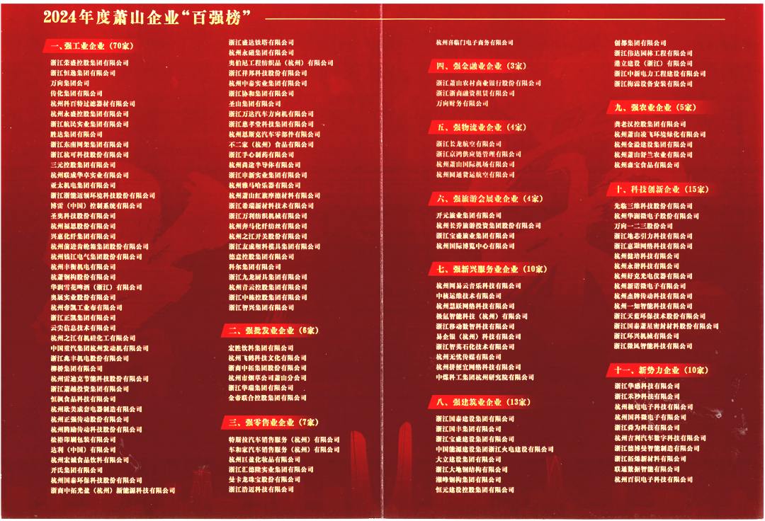 為進一步推動高質(zhì)量發(fā)展,鼓勵廣大企業(yè)在高質(zhì)量共富中扛起企業(yè)擔(dān)當(dāng),打造新時代共同富裕全域新標(biāo)桿,構(gòu)建優(yōu)勢互補、高質(zhì)量發(fā)展的區(qū)域經(jīng)濟布局,特認定蕭山區(qū)百強企業(yè)。該榜單每年評選一次,旨在評選出蕭山區(qū)標(biāo)桿企業(yè),鼓勵企業(yè)做大做強,著力增強企業(yè)創(chuàng)新能力,提升企業(yè)的綜合實力。萬向集團、傳化集團、恒逸集團、榮盛控股集團等蕭山區(qū)知名企業(yè)皆入選榜單。