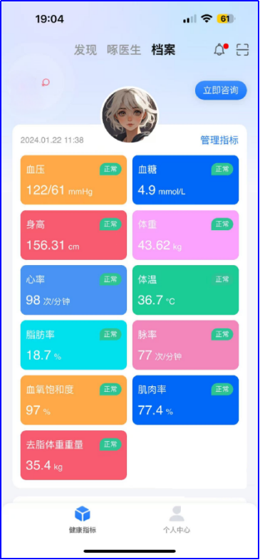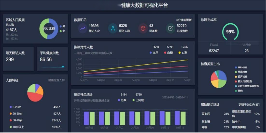 建設(shè)了基于疾病風(fēng)險(xiǎn)評估的健康畫像系統(tǒng),為居民提供精準(zhǔn)、個(gè)性化的健康服務(wù),實(shí)時(shí)監(jiān)測患者的健康狀況,記錄并分析患者的各項(xiàng)生理指標(biāo),為醫(yī)生制定個(gè)性化的治療方案提供數(shù)據(jù)支持?;颊呖赏ㄟ^移動(dòng)端隨時(shí)查看自己的健康數(shù)據(jù),了解自己的健康狀況,從而更好地參與和管理自己的健康。