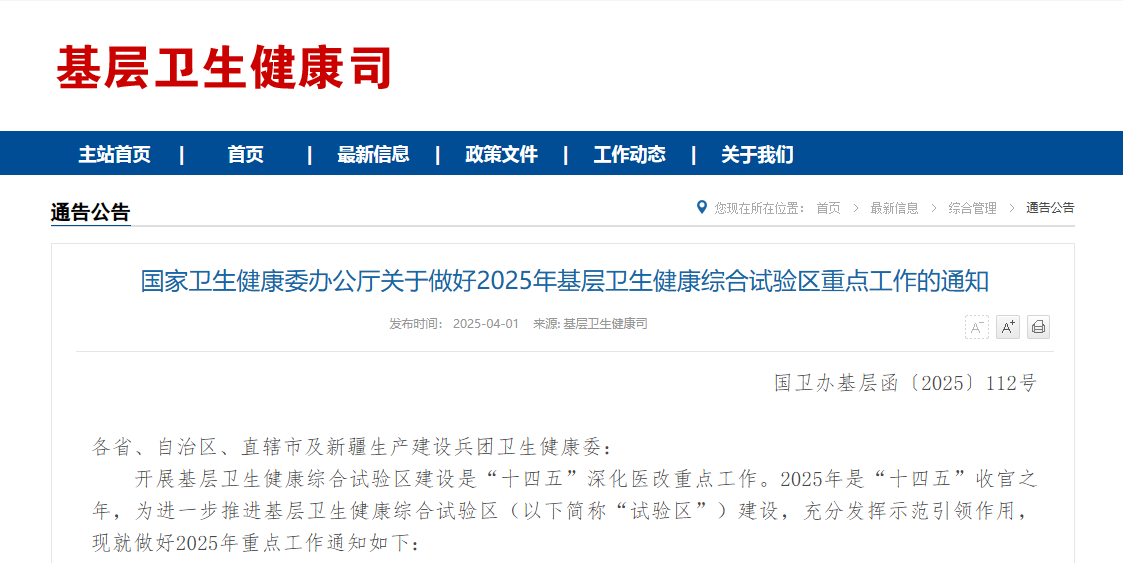 2025年4月1日,國家衛(wèi)生健康委辦公廳發(fā)布了《關于做好2025年基層衛(wèi)生健康綜合試驗區(qū)重點工作的通知》。這不是普通的政策通知,而是以“深化醫(yī)改攻堅年”為旗號,掀起基層衛(wèi)生健康服務能力“跨越式革命”的行動指南。作為“十四五”規(guī)劃的收官之年,這份文件不僅將試驗區(qū)建設納入國家衛(wèi)健委領導的重點聯(lián)系省份工作,還拋出了十大顛覆性任務,直指基層醫(yī)療的“痛點”和“未來”。
