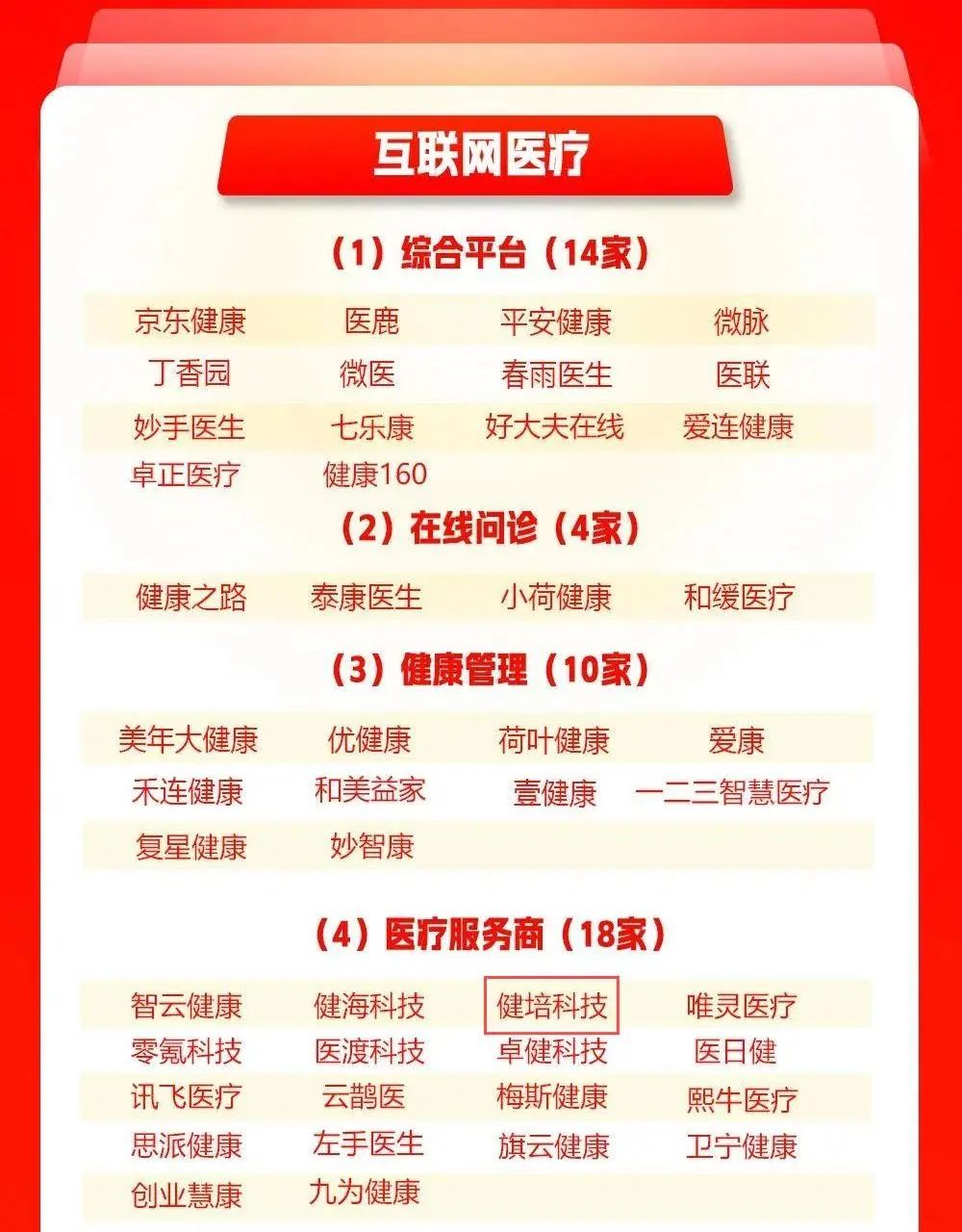 4月24日,我國(guó)“一帶一路”TOP10影響力社會(huì)智庫(kù)網(wǎng)經(jīng)社電子商務(wù)研究中心發(fā)布2024年度的《2024年中國(guó)數(shù)字健康“百?gòu)?qiáng)榜”》,上榜的有丁香園、微醫(yī)、美年大健康等,其中互聯(lián)網(wǎng)醫(yī)療服務(wù)商類上榜的18家企業(yè)中,健培科技再次上榜。