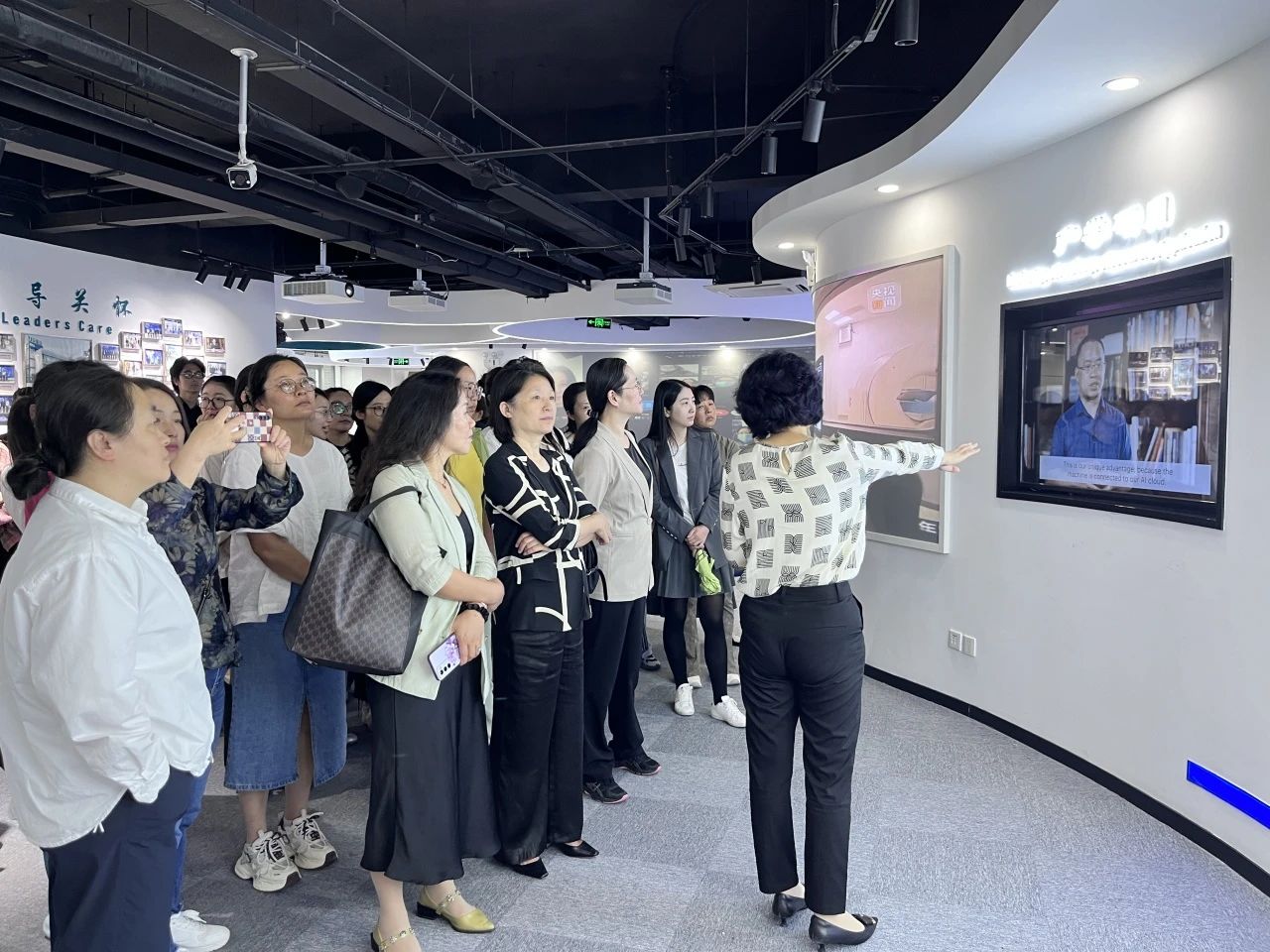 全國(guó)三八紅旗手、全國(guó)杰出創(chuàng)業(yè)女性、全國(guó)巾幗建功標(biāo)兵、浙江省政協(xié)委員、杭州市婦聯(lián)執(zhí)委、杭州市女知識(shí)分子聯(lián)誼會(huì)會(huì)長(zhǎng)、健培科技婦聯(lián)主席、聯(lián)合創(chuàng)始人季紅麗;健培科技婦聯(lián)副主席閆亞亭;健培科技婦聯(lián)執(zhí)委、黨支部書記謝金波熱情接待。季總帶領(lǐng)考察團(tuán)參觀了健培科技醫(yī)療AI國(guó)際創(chuàng)新中心,詳細(xì)介紹了公司的基本情況,以及公司促進(jìn)、扶持并服務(wù)女性創(chuàng)新創(chuàng)業(yè)的情況,并展示了人工智能在醫(yī)療健康行業(yè)的創(chuàng)新應(yīng)用。季總還分享了健培婦聯(lián)利用人工智能、云計(jì)算、大模型等新興技術(shù)融入基層健康管理工作中,保障婦女、兒童以及老人群體的健康權(quán)益,通過啄醫(yī)生AI診室載體對(duì)社區(qū)居民的健康體征進(jìn)行日常監(jiān)管,有效發(fā)揮婦女獨(dú)特作用,是推進(jìn)健康領(lǐng)域婦女組織建設(shè)重要舉措。