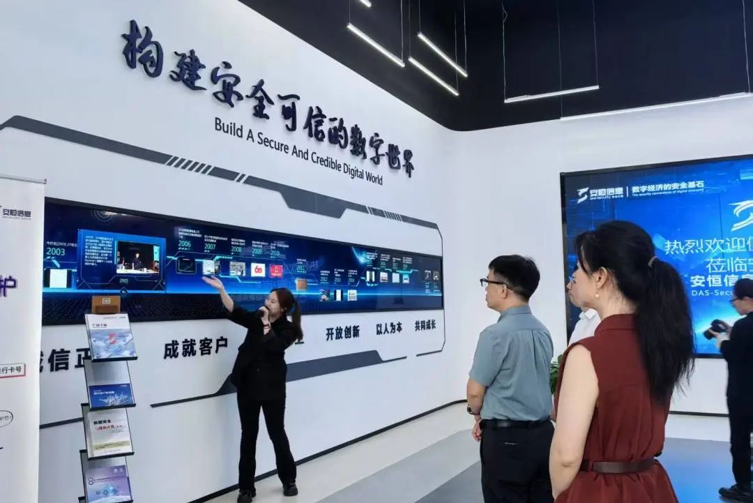 健培科技領(lǐng)導(dǎo)一行參觀了安恒信息安全創(chuàng)新體驗(yàn)中心,詳細(xì)了解安恒信息的主營業(yè)務(wù)范圍、已取得的成果、企業(yè)文化建設(shè)等情況。展廳集中展示了安恒信息在網(wǎng)絡(luò)安全、數(shù)據(jù)安全、云安全、物聯(lián)網(wǎng)安全等領(lǐng)域的前沿技術(shù)與創(chuàng)新成果。