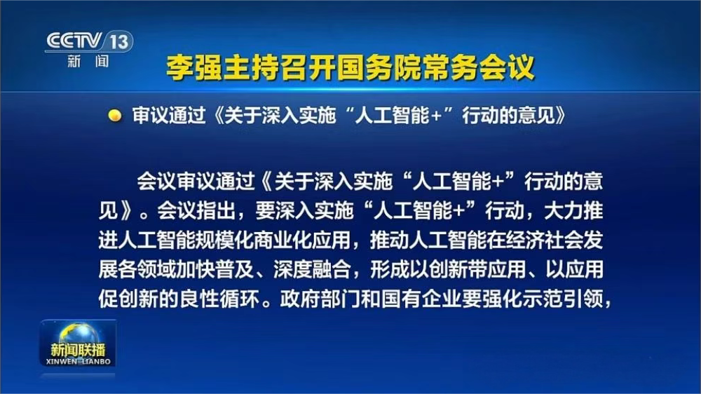 7月31日,國(guó)務(wù)院總理李強(qiáng)主持召開國(guó)務(wù)院常務(wù)會(huì)議,審議通過(guò)《關(guān)于深入實(shí)施“人工智能+”行動(dòng)的意見》。系統(tǒng)部署規(guī)?;瘧?yīng)用、生態(tài)構(gòu)建與安全治理框架。會(huì)議指出,要深入實(shí)施“人工智能+”行動(dòng),大力推進(jìn)人工智能規(guī)模化商業(yè)化應(yīng)用,推動(dòng)人工智能在經(jīng)濟(jì)社會(huì)發(fā)展各領(lǐng)域加快普及,深度融合,形成以創(chuàng)新帶應(yīng)用,以應(yīng)用促創(chuàng)新的良性循環(huán)。