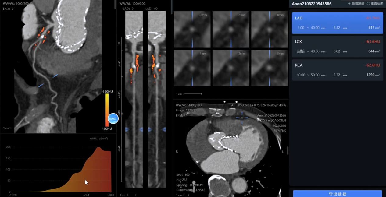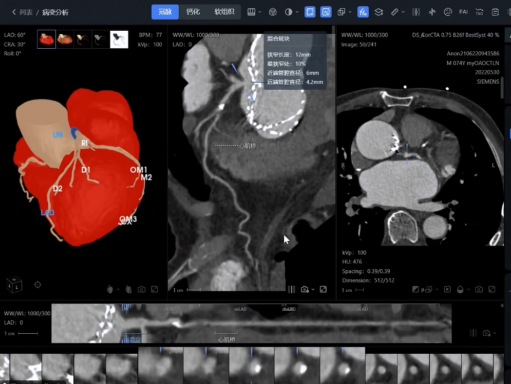 影像分析方面:系統(tǒng)能夠自動(dòng)處理心血管CTA、腦血管MRA、外周血管超聲等多模態(tài)影像數(shù)據(jù),精準(zhǔn)識(shí)別斑塊性質(zhì)、狹窄程度和病變范圍,生成結(jié)構(gòu)化報(bào)告。