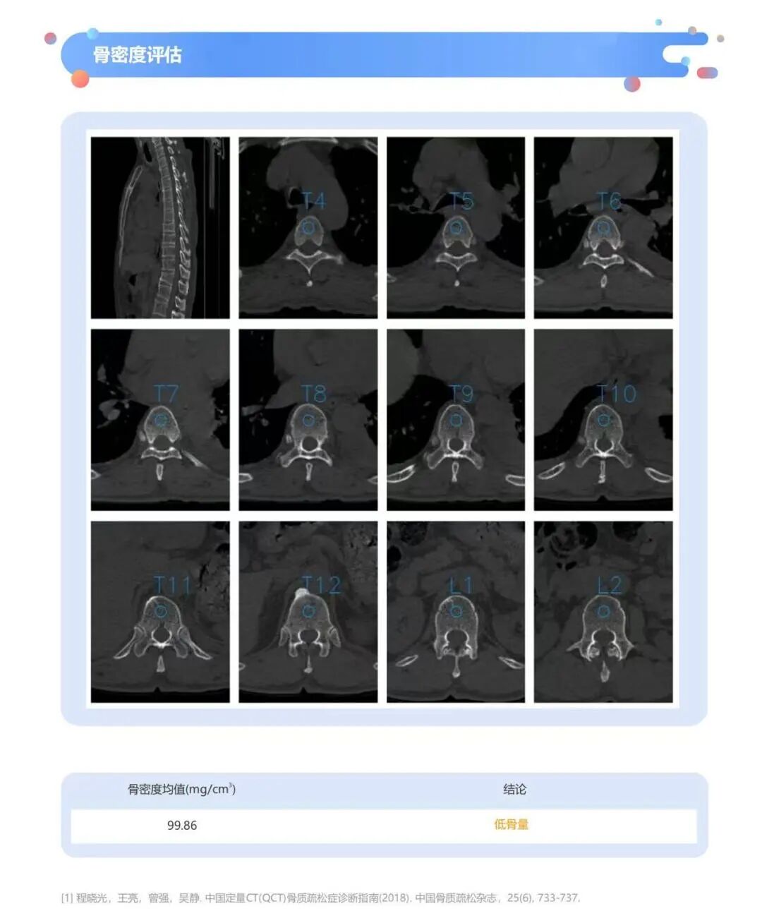 2025 年版《成人健康體檢項(xiàng)目推薦指引》明確:40 歲以上人群常規(guī)體檢新增骨密度檢測(cè)項(xiàng)目,體脂率、肌肉脂肪分布情況也納入檢查,且定量 CT(QCT)被列為骨密度檢測(cè)優(yōu)先推薦。 健培啄醫(yī)生胸部CT一檢多篩無需額外掃描,依托常規(guī) CT 影像即可完成骨密度檢測(cè),實(shí)現(xiàn) “篩 - 診 - 評(píng)” 一體化,為 40 + 人群骨健康管理及骨質(zhì)疏松等慢性病風(fēng)險(xiǎn)評(píng)估,提供高效、精準(zhǔn)的技術(shù)支持,助力落實(shí)科學(xué)健康篩查。