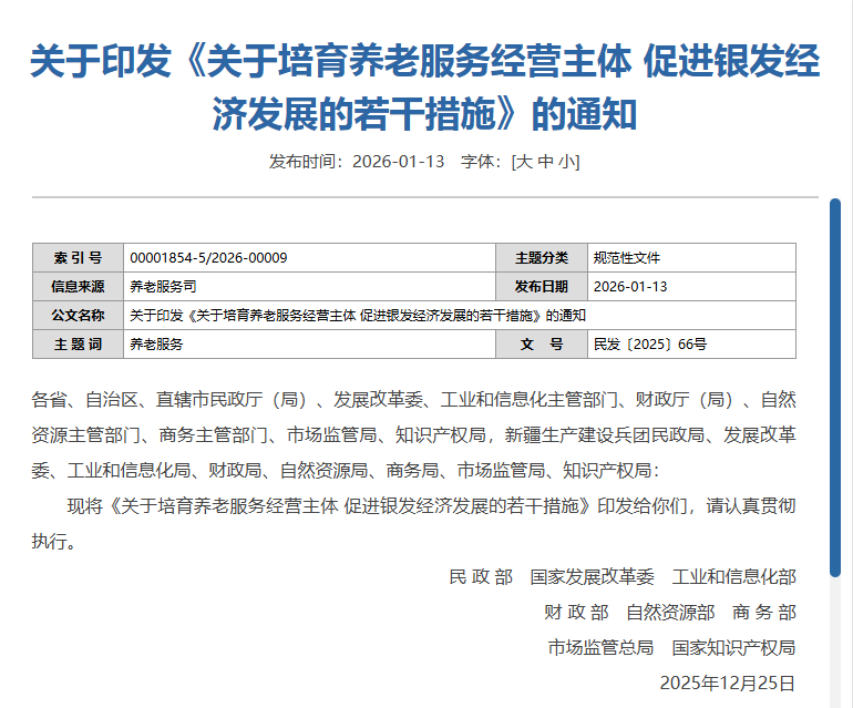 2026年1月13日, 民政部等八部門聯(lián)合印發(fā)《關(guān)于培育養(yǎng)老服務(wù)經(jīng)營(yíng)主體 促進(jìn)銀發(fā)經(jīng)濟(jì)發(fā)展的若干措施》 (以下簡(jiǎn)稱《若干措施》),聚焦品牌化建設(shè)、供需平臺(tái)搭建、發(fā)展環(huán)境優(yōu)化等方面,提出14項(xiàng)具體舉措,旨在系統(tǒng)性培育養(yǎng)老服務(wù)經(jīng)營(yíng)主體,激發(fā)市場(chǎng)活力,推動(dòng)銀發(fā)經(jīng)濟(jì)高質(zhì)量發(fā)展。?
