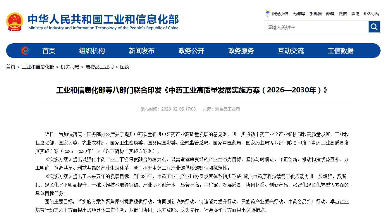 《實(shí)施方案》提出了未來(lái)五年的發(fā)展目標(biāo):到2030年,中藥工業(yè)全產(chǎn)業(yè)鏈協(xié)同發(fā)展體系初步形成,重點(diǎn)中藥原料持續(xù)穩(wěn)定供應(yīng)能力進(jìn)一步增強(qiáng),數(shù)智化綠色化水平明顯提升,一批關(guān)鍵技術(shù)取得突破,產(chǎn)業(yè)協(xié)同創(chuàng)新水平顯著提高。